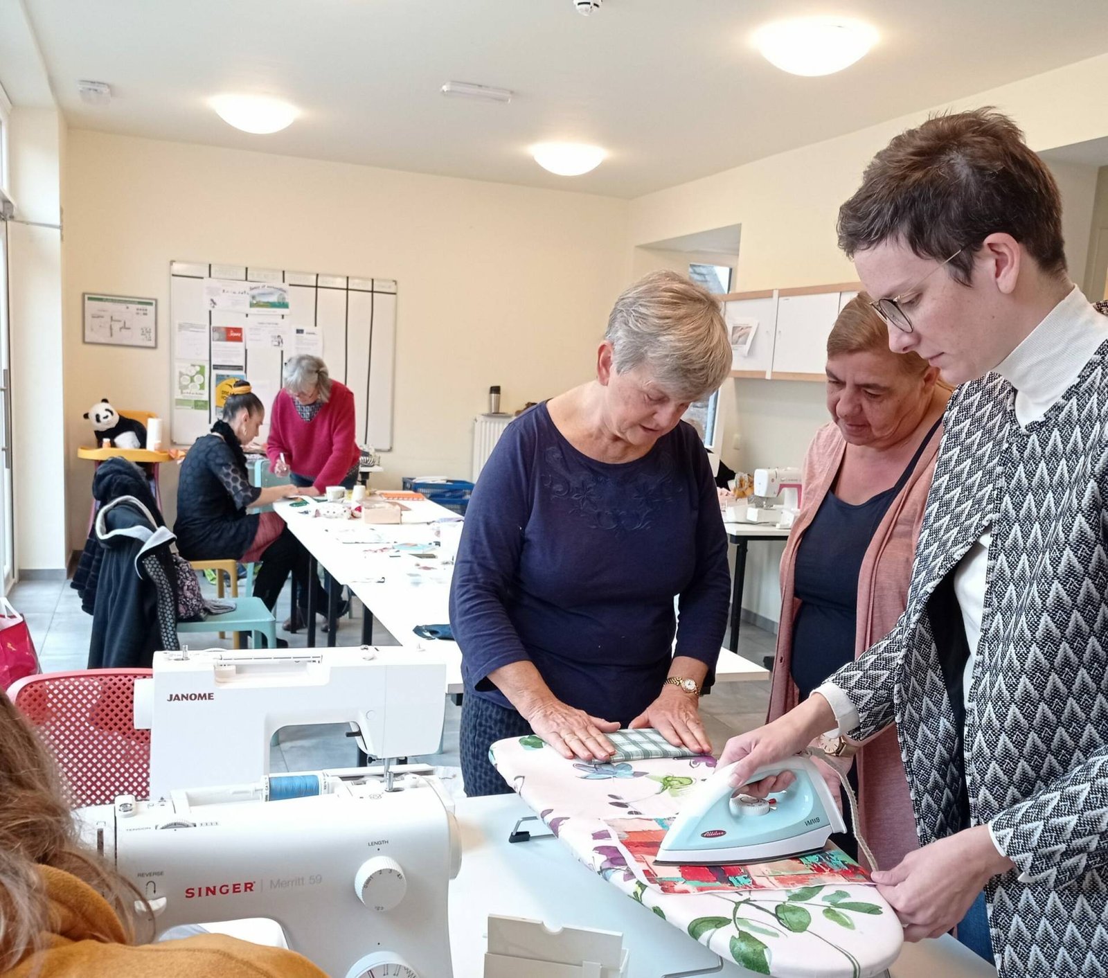 Régine, Anne, Mireille et Pascale, couturières bénévoles : “Nous sommes 4 “jeunes retraitées” passionnées par la couture et désireuses de partager cette passion avec les résidentes des Trois Portes. Lorsque nous « débarquons » le lundi avec tissus, machines, ciseaux et autres « outils » de couturière, nous avons la joie de nous retrouver dans une ambiance chaleureuse et sommes touchées par l’enthousiasme, la persévérance, le sourire et l’esprit d’entraide et de convivialité qui règnent au sein de ce sympathique groupe. A chaque fois, celles dont la semaine a débuté difficilement (« comme un lundi » !) repartent avec un visage souriant et détendu, fières des ouvrages qu’elles ont réalisés. Et nous, nous rentrons chez nous le cœur rempli de ces belles rencontres.”